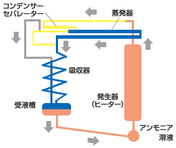 コンプレッサーと同様に冷媒の気化熱を利用する方式。冷媒にアンモニアを使用。コンプレッサーと比較すると静音で振動もほとんどありません。経年劣化が少ないため、長い期間使用できますが、冷却力はコンプレッサーに劣ります。